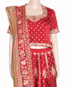 Ritu Kumar Bridal Lehenga is meticulously handcrafted from premium red silk, celebrated for its rich luster and substantial, royal drape. The ensemble is defined by a voluminous, floor-length skirt featuring dense zardosi and sequin embroidery arranged in traditional floral "butis" and geometric patterns. The set includes a coordinating half-sleeve blouse adorned with intricate metallic threadwork along the neckline, sleeves, and hem. Completing this breathtaking three-piece set is a matching red silk dupatta featuring a heavily embroidered border and scattered sparkling accents throughout.