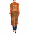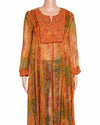 Ritu Kumar Orange Printed Dress is rendered in a premium lightweight fabric featuring an intricate all-over botanical print in warm shades of orange, terracotta, and sunset yellow, accented with deep green leafy patterns. he design is defined by its elaborate yoke detailing, which features a contrasting deep-orange panel adorned with intricate traditional embroidery and mirror-style accents at the neckline. A standout feature is the airy, maxi-length profile, providing effortless movement and a graceful drape.