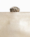 Roberto Cavalli Metallic Leather Clutch Bag, designed for high-impact evening glamour. The clutch is crafted from soft, supple leather with a rich Metallic Gold finish, offering a slouchy, elegant fold-over silhouette. The design is subtly luxurious, featuring a unique, sculptural piece of gold-toned hardware.