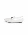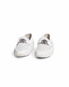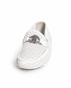 Roberto Cavalli Men's Perforated White Leather Loafers, these loafers are expertly crafted from premium white calf leather featuring a meticulous, all-over geometric perforation that ensures maximum breathability and a modern, airy aesthetic. The classic moccasin-toe silhouette is elevated by a striking gunmetal-tone RC monogram hardware across the vamp, serving as a bold signature of the House’s glamour.