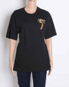 This Roberto Cavalli men's t-shirt is a classic black cotton piece with a comfortable crew neck and short sleeves. Adding a touch of the brand's distinctive style is an embroidered or embellished design on the left chest. This detail showcases a stylized palm tree, possibly intertwined with a snake motif, creating a subtle yet luxurious accent on the solid black .