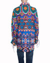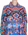 Saaksha & Kinni Printed Blue Cambric Ikat Shirt is crafted from cambric cotton, a lightweight and breathable fabric ideal for daytime elegance. The design features a bold, all-over Ikat-inspired print in a rich blue and multi-color palette. The silhouette is defined by its contemporary batwing sleeves and a tailored collar, offering a "luxe-boho" aesthetic that balances comfort with high impact. Unique waist tie-up details allow for a customizable fit, while the front button fastening adds a classic touch.