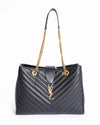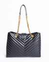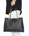 Saint Laurent Black Matelassé Leather Cassandre Shopper Tote is a sophisticated and highly coveted accessory. The bag is crafted from a soft, black leather with a striking diagonal quilting pattern. It features a structured, tote silhouette with a secure top closure and two polished gold-tone chain straps with leather shoulder pads, allowing for comfortable shoulder wear. The standout detail is the iconic gold-tone "YSL" logo on a leather tab at the front, which adds a touch of signature luxury