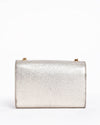 Saint Laurent Kate Bag is the perfect evening accessory. It is crafted from Shimmer Metallic Gold Leather in a dazzling gold hue, featuring a structured rectangular flap silhouette. The bag is instantly recognizable by the iconic oversized gold-tone Cassandre YSL logo prominently placed on the flap.