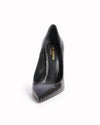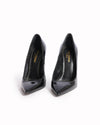 Saint Laurent Opyum Leather Pumps are rendered in high-shine black patent leather. The standout feature of this iconic model is the sculptural YSL monogram heel, crafted from interlocking black-tone metal initials that serve as a bold statement of brand heritage. Finished with a luxurious leather-lined interior featuring the gold-stamped "SAINT LAURENT PARIS" logo.