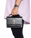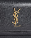 Saint Laurent Small Sunset Crossbody Bag is rendered in premium Grain de Poudre embossed leather in a timeless black, featuring sophisticated gusseted sides and a classic flap-top that provides a polished, multi-dimensional profile for both day and evening ensembles. A standout feature is the iconic interlaced YSL initials in a brushed gold-tone, a definitive mark of archival luxury that anchors the front with brilliant luster. Finished with a versatile gourmette chain-and-leather shoulder strap and a secure magnetic fastening.