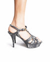 Saint Laurent Tribute Snake-Embossed Leather Platform Sandals is rendered in premium calf leather with an intricate snake-skin embossing in a monochrome palette. The design is defined by its contemporary interwoven strappy vamp, featuring a sophisticated knotted detail. A standout feature is the statuesque stiletto heel paired with a secure T-strap ankle closure, a definitive mark of archival Saint Laurent luxury that captures the light with brilliant luster.