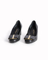 Salvatore Ferragamo Black Leather Pumps are rendered in premium black pebbled leather. The design is defined by its contemporary rounded-toe silhouette, which provides a soft, feminine contrast to the shoe’s more industrial elements. A standout feature is the sculptural block heel, which features a unique "column" or fluted texture that adds a distinctive modern edge to the classic pump. The vamp is adorned with an oversized tonal leather bow, centered with a sleek, polished gold-tone hardware bar for a touch of signature luxury.