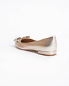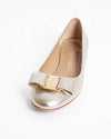 Salvatore Ferragamo Leather Ballet Flats are a perfect blend of comfort and timeless sophistication. They are crafted from a luxurious metallic gold leather, offering a subtle, textured sheen. The shoes feature a classic ballet flat silhouette with a rounded toe and are adorned with the brand's iconic gold-tone Vara bow detail on the front, complete with a signature branded buckle. These flats are a versatile and elegant choice, suitable for both casual and dressier occasions.