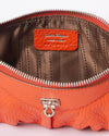 Salvatore Ferragamo leather clutch in orange is a stunning accessory! Featuring a zip closure and the brand logo on the front, it combines elegance with practicality. Perfect for special occasions or a night out, it comes in a box