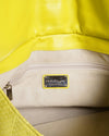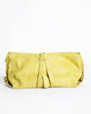 Salvatore Ferragamo Vegan Leather Handbag is a bold and stylish accessory. The bag is crafted from a material with a striking python skin texture in a lime green hue. The design features a unique, folded or clutch-style silhouette, secured by thin leather straps with prominent silver-toned circular buckle hardware and rings.
