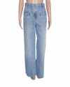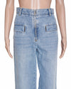 Sandro Paris High-Waisted Wide-Leg Jeans are rendered in premium heavy-weight cotton denim in a sophisticated light vintage wash. The design is defined by its contemporary retro-inspired silhouette, featuring a sophisticated ultra-high waist and a dramatic wide leg. A standout feature is the unique flap-pocket detailing on the front hips a definitive mark of archival Sandro luxury that anchors the design with a modern, utilitarian edge. Finished with a sleek zip-front closure, reinforced tonal topstitching.
