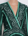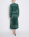 Sandro Paisley Printed Dress in a stunning deep green. This beautiful midi dress features a sophisticated all-over paisley print in a lighter green & white, creating a captivating and artistic aesthetic. The design includes a flattering V-neck, a cinched waist, and a gracefully pleated skirt that adds movement and romance.