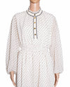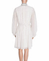 Sandro Rosalie Georgette Puff Sleeve Dress is rendered in a lightweight, semi-sheer white georgette fabric, featuring a timeless all-over black polka dot print, featuring a high ruffled neckline and a partially buttoned placket adorned with polished gold-tone snap fasteners. A standout feature is the billowing puff sleeves, which are finished with elasticated cuffs to create a dramatic yet airy volume. The waist is highlighted by a smocked, elasticated band that ensures a flattering fit while transitioning into a fluid, multi-layered mini skirt. Finished with delicate black piping along the collar and placket.