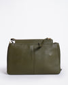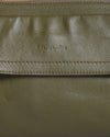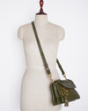 See by Chloé Phill Sling Bag. This versatile and stylish bag is crafted from pebbled leather in a versatile olive green hue. It features a chic front flap, a unique oversized ring hardware detail, and a prominent front pocket for easy access. The bag also comes with a detachable and adjustable strap, which the prompt refers to as a "belt," offering hands-free convenience.