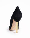 Sergio Rossi pumps are a bold and glamorous statement piece. They are crafted from a soft black suede and feature a striking, all-over leopard print in gold and black. The shoes are embellished with delicate studs, which add a touch of modern edge and sparkle. The classic pointed-toe silhouette and high stiletto heel