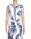 Stella McCartney Andrea Shell Printed Dress is rendered in a fluid, lightweight white fabric, offering a luxurious drape that serves as a canvas for the striking oversized seashell illustrations, sculptural silhouette, featuring a sleeveless construction with an elegantly draped wrap front that creates a modern and feminine profile. A standout feature is the bold navy-blue shell print, showcasing intricate hand-drawn details of various conches and nautilus shells that wrap artistically around the body. Finished with a discreet side-button fastening and a curved, asymmetrical hemline.