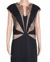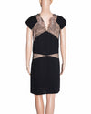 Stella McCartney Color-Block Mini Sheath Dress is rendered in a premium black fabric with contrasting panels. A standout feature is the intricate floral lace inserts in a warm tan/nude tone, which are set against sharp black rays to create a striking visual impact. Finished with a delicate black lace trim along the V-neckline and sleeveless cap-style shoulders.