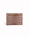 Stella McCartney Printed Pouch is rendered in a premium vegan leather fur textured material, featuring a striking leopard print in a natural palette of brown, tan, and black tones. A standout feature is the polished silver-tone logo plaque discreetly centered at the top, serving as a definitive mark of the brand's luxury identity. Finished with a secure top-zip closure and a minimalist aesthetic.