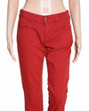 Stella McCartney Red Tailored Denims are rendered in a premium stretch denim in a striking red. A standout feature is the classic five-pocket construction, which is elevated by tonal stitching and polished hardware to maintain a sleek, monochromatic aesthetic. Finished with a mid-rise waist, traditional belt loops, and a secure button-and-zip fly closure.