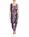 Suneet Varma Pink and Black Kurta Set is rendered in a vibrant pink and midnight black palette. The design is defined by its intricate textural layering and glamorous embellishments. A standout feature is the heavily beaded bodice and waistline, accented with a centralized pink crystal floral motif and delicate lace-style borders. Finished with coordinated printed trousers and a matching dupatta with a scalloped lace hem.