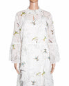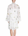 Ted Baker Andray Bird Printed Ruffle Dress is rendered in a lightweight, semi-sheer white fabric, featuring a stunning all-over hummingbird print in vibrant shades of green, blue, and orange, interspersed with delicate metallic gold-flecked detailing for a subtle, light-catching finish. The design is defined by its intricate textural details, featuring a high smocked neckline and a ruffled bib that adds a touch of Victorian-inspired charm. A standout feature is the billowing bell sleeves, which are accented with delicate lace-insert bands and transition into a dramatic, tiered ruffle skirt that creates beautiful movement with every step. Finished with a slender tie-neck and a defined waistline.