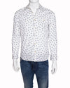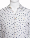 Ted Baker Floral Print Long-Sleeve Shirt is crafted from premium white cotton, offering a crisp and refined finish. The design is defined by an all-over micro-floral motif featuring small-scale navy and dark blue blossoms that create a sophisticated, rhythmic pattern. A standout feature is the meticulous attention to detail, including a coordinated chest pocket and a classic pointed collar that maintains a sharp, tailored profile. This piece delivers a polished yet contemporary aesthetic ideal for both smart-casual and formal styling.