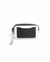 Marc Jacobs Mini Snapshot Crossbody Bag is rendered in premium beige and black Saffiano leather. A standout feature is the oversized "Double J" hardware on the front, rendered in a sleek gunmetal or black-tone finish that serves as a definitive mark of the brand's contemporary identity. Finished with dual top-zip closures that open to separate compartments and a wide, detachable webbing strap.