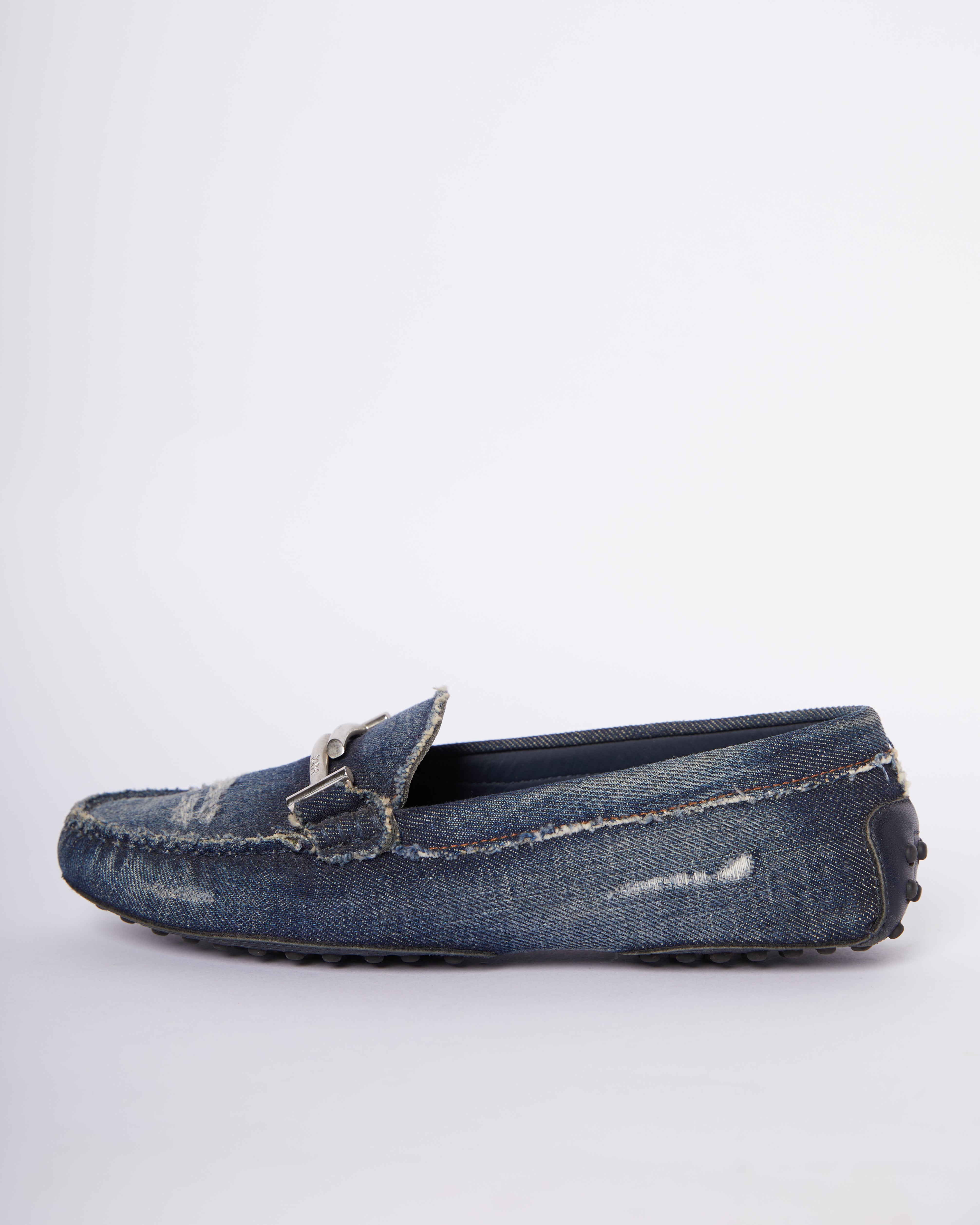 These elegant Tod's Gommino driving shoes are crafted in denim with exposed handmade stitching and feature the signature Tod's Double T metal branded clamp. The shoes boast a rubber pebble detailing on the heel and an iconic rubber pebbl