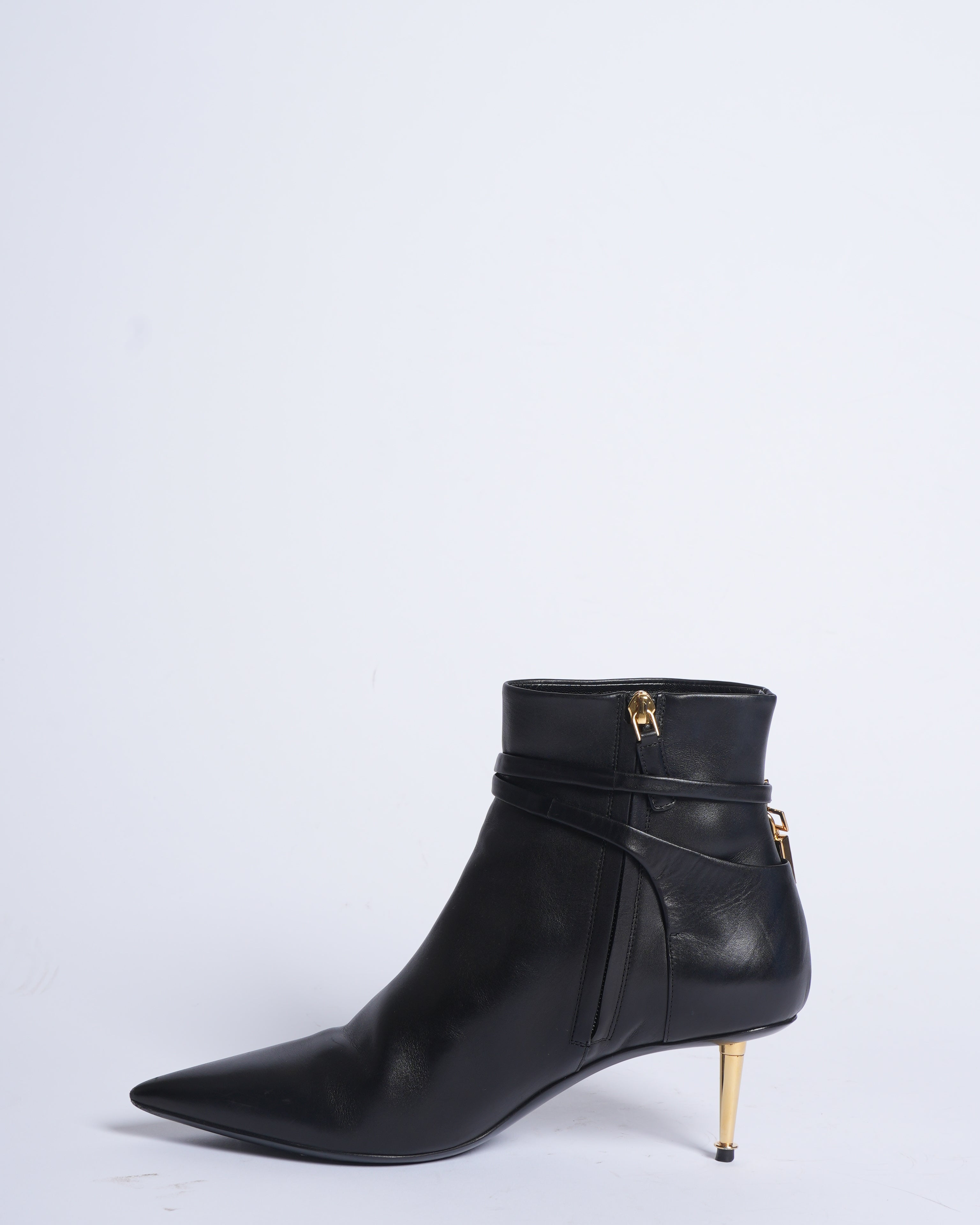 Chic black leather boots with golden-tone heels and a belt detail, epitomizing Tom Ford's bold, luxurious designs.