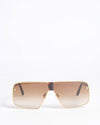 Tom Ford Women's Sunglasses featuring a large, angular aviator silhouette with an exaggerated rectangular shape. The frame is thin gold-toned metal around the lenses. The lenses are brown-tinted with a gradient finish. The top bridge and arms feature subtle Tom Ford branding, and the arm tips are finished in dark brown acetate.