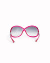 Tom Ford Women's Sunglasses in Pink are rendered in a vibrant translucent pink acetate frame. The design is defined by its oversized, rounded butterfly silhouette, providing a dramatic look and excellent sun coverage. A standout feature is the iconic rose gold-tone "T" logo at the temples, which extends seamlessly from the frame onto the slender metal arms, serving as a definitive mark of Tom Ford’s refined craftsmanship. Finished with gradient dark-tinted lenses and polished metallic hardware.