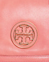 Tory Burch Shoulder Bag is meticulously crafted from premium peach pink pebbled leather, offering a soft, supple texture and a durable, high-quality finish. The design is defined by its iconic Amanda silhouette, featuring a rounded-edge flap and a slim, streamlined profile. A standout feature is the oversized circular leather-inlaid logo prominently centered on the front, rendered in radiant gold-tone metal. The bag is elegantly finished with a luxury gold-tone chain strap featuring a tonal leather shoulder guard for comfort.