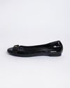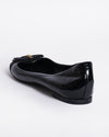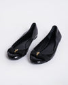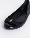 Tory Burch Ballet Flats in black. These elegant flats feature a sleek rounded-toe silhouette, beautifully crafted from glossy patent leather. The design is complemented by a delicate bow and a prominent gold-tone logo medallion on the front, instantly recognizing its designer heritage.