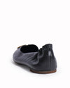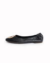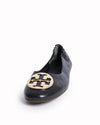 Tory Burch Minnie Travel Ballet Flats are rendered in a premium black leather with a subtle metallic shimmer, defined by its classic round-toe silhouette and a highly flexible construction. A standout feature is the oversized, polished gold-tone "Double T" logo medallion on the toe, which serves as an iconic mark of the brand's heritage.