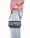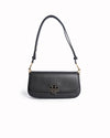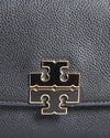 Tory Burch Black Britten Convertible Crossbody Bag is rendered in premium black pebbled leather. The design is defined by its sleek, rectangular silhouette and a focus on polished metallic accents. A standout feature is the oversized gold-tone Britten logo on the front flap, which serves as a definitive mark of the brand's luxury identity. Finished with a convertible chain-and-leather strap and a secure magnetic snap closure.