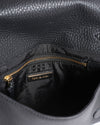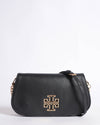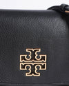 Tory Burch Crossbody Bag is crafted from premium black pebbled leather, known for its soft texture and durability. The front flap is prominently adorned with the iconic double-T logo in a striking gold-tone cut-out design. It features a sophisticated intertwined leather and gold-tone chain strap, allowing it to be worn as a shoulder bag or crossbody.