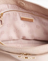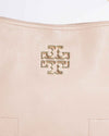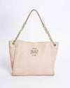 Tory Burch shoulder bag presents a soft and feminine aesthetic in a delicate blush pink hue. The bag features a flap-front design with a prominent gold-toned Tory Burch logo. The combination of a chain strap and a leather shoulder pad suggests comfortable wear and versatile styling options.