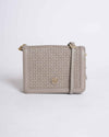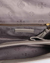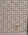 The Tory Burch crossbody bag pictured is a refined and elegant accessory featuring a soft grey tone and intricate quilted pattern throughout. Crafted from high-quality leather, the bag is adorned with the signature Tory Burch double-T logo in gold-tone hardware for a touch of understated luxury. Its structured shape and adjustable leather strap offer versatile styling options, perfect for hands-free wear. Compact yet functional, this crossbody is ideal for carrying your daily essentials in effortless style, making it a chic companion for both casual outings and sophisticated events.