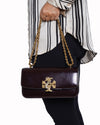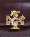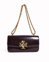 Tory Burch Eleanor Rectangular Bag is defined by its clean, boxy silhouette and exceptional craftsmanship. This specific model is crafted from a rich, deep Maroon polished leather with hand-painted edges. The centerpiece is the sculptural gold-tone hardware, which transforms the classic Tory Burch emblem into a shimmering jewel of a clasp. he bag is as functional as it is striking, featuring a twisted rope chain strap that can be worn long for crossbody ease or doubled up for a sophisticated shoulder look.