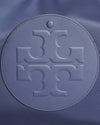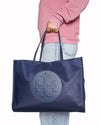 Tory Burch Ella Tote Bag in Navy Blue is rendered in a premium, durable matte fabric designed for everyday functionality with a refined finish. A standout feature is the large tonal Double T logo patch prominently centered on the front, offering a signature yet subtle monochromatic statement. Finished with slender top handles and reinforced stitching for added durability, this spacious tote is ideal for daily essentials, work, or travel while maintaining a polished, contemporary look.