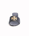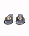 Tory Burch Everly Block Heel Slides, this iconic footwear is meticulously crafted from premium buttery-soft calfskin leather. The design is anchored by its legendary house codes, featuring a statuesque oversized gold-tone Double T logo that reflects Tory Burch. Featuring a comfortable mid-height block heel and a streamlined single-strap construction.