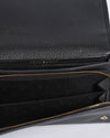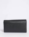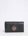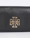 Tory Burch Flap Wallet crafted from black pebbled leather. The wallet features a fold-over flap closure prominently accented with the signature large gold-toned Double T logo, which has a cut-out design and appears slightly antiqued or bronzed. The wallet is finished with a gold-toned zipper pull on the side pocket.