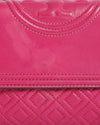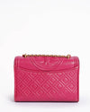 Tory Burch Fleming Quilted Shoulder Bag is a stylish and versatile accessory. The bag is crafted from a supple leather in a bold, eye-catching shade of fuchsia pink. It features a classic quilted diamond pattern on the body and a smooth, elegant flap closure with a prominent, embossed Double T logo. The bag has a gold-tone chain and leather strap, allowing it to be worn as a shoulder bag or crossbody.