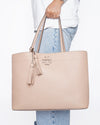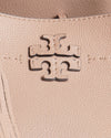Tory Burch Leather Tote is a versatile and elegant accessory, perfect for everyday sophistication. The bag is crafted from a durable, beautifully textured pebbled leather in a classic tan color. The bag is accented with a stylish leather tassel and the brand's iconic double-T logo in a leather finish on the front.