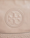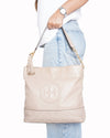 Tory Burch Fleming Soft Hobo is defined by its elegant diamond pattern pintucks. The bag's design is centered around the signature embossed Double T logo at the front and a beautifully braided chain-and-leather strap that adds a touch of high-fashion glamour.