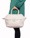 Tory Burch Handbag is meticulously crafted from premium light pink pebbled leather, offering a durable, grainy texture with a soft and supple feel. The design is defined by its elegant top-handle silhouette, featuring a structured body with a front flap pocket for quick-access essentials. A standout feature is the square gold-tone logo plaque, featuring the iconic Double T logo centered on the front flap as a refined hallmark of the house. The bag is equipped with dual rolled leather top handles and a matching adjustable, detachable shoulder strap.
