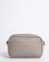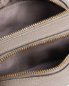 Tory Burch Camera Bag is expertly crafted from premium pebbled leather in a sophisticated grey. The bag’s front is prominently featured with the iconic oversized Double T logo, which is tonal and embossed into the leather for a subtle yet luxurious look. Designed with a structured rectangular silhouette and rounded corners, it features a secure top-zip closure and polished gold-tone hardware. The bag is equipped with a matching slim leather crossbody strap that is both adjustable and detachable.