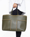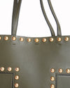 Tory Burch Tote Bag offers a bold statement, blending classic structure with edgy hardware. Crafted from smooth, structured Olive Green Leather, the bag features a vertical silhouette and comfortable top handles. The design is heavily accented by gleaming Gold-Tone dome studs arranged in horizontal bands and vertical lines, emphasizing the bag's architectural structure.