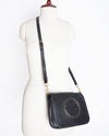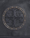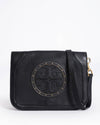 Tory Burch Crossbody Bag offers a timeless and recognizable style, perfect for everyday wear. Crafted from durable Black Pebbled Leather, the structured flap silhouette is highlighted by the oversized Double 'T' logo embossed at the center, framed by a bold gold-tone circular medallion accented with subtle stud detailing. The adjustable crossbody strap allows for comfortable, hands-free convenience, making this a versatile and stylish accessory.